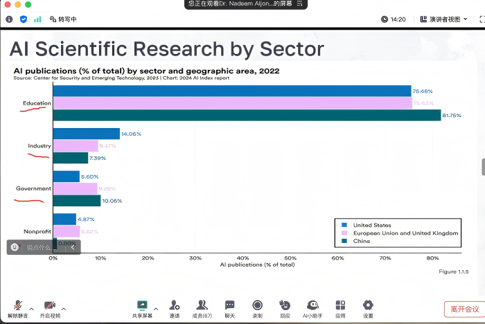 更新时间:2025-04-25 13:59 4月15日晚,商学院开展本月学术活动,本次学术活动由商学院NADEEM博士带来主题为《人工智能与绿色全要素生产率之间的相互作用》的学术讲座。讲座中,NADEEM博士主要就AI指数的介绍及其发展、构建复核人工指数的方法、人工智能通过其三个分解与GTFP的交互、人工智能对GTFP的影响结果(以中国为例)等方面对全体教师进行了介绍。