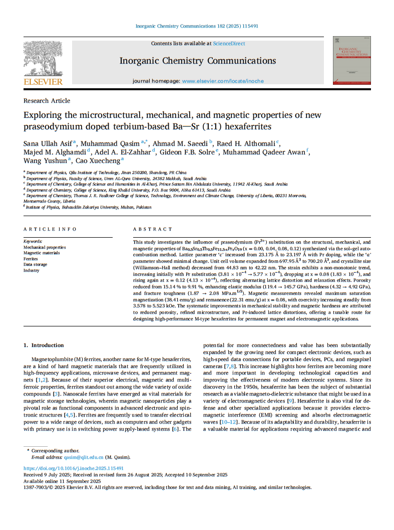 基础二部Sana Ullah Asi在《Inorganic Chemistry Communications》发表论文