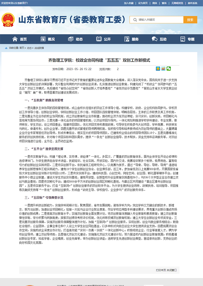 山东省教育厅:FH手机入口:校政企协同构建“五五五”双创工作新模式