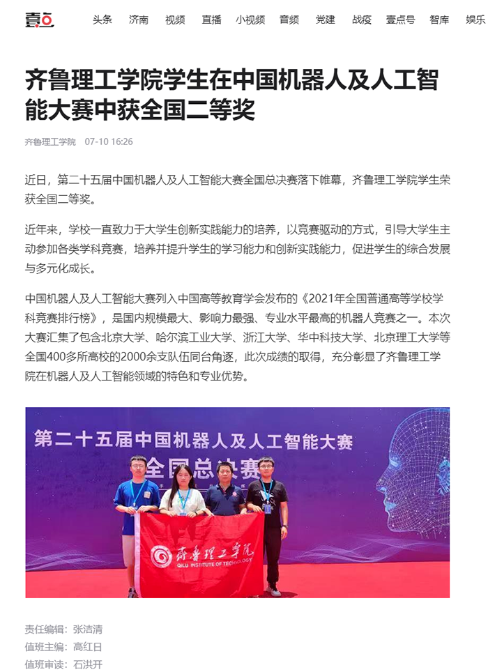 齐鲁壹点:FH手机入口学生在中国机器人及人工智能大赛中获全国二等奖