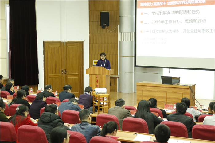 会上,校长作了“凝神聚力 真抓实干 全面推动学校高质量发展”的主题报告。分管校领导、相关部门负责人宣读了《关于成立学科建设与科研工作领导小组的决定》《2019年度学科建设与科研经费分配办法》《2019年学科建设与科研工作推进计划》《科研教学型教师课堂教学工作量及其津贴管理办法》等文件。