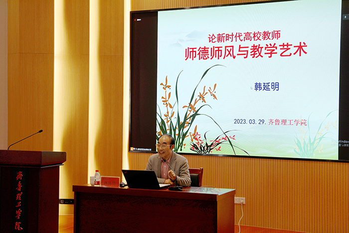 报告中,韩延明教授以《论新时代高校教师师德师风与教学艺术》为题,围绕新世纪、新时代、新形势下如何进行师德师风建设,展现教学艺术,从五个方面为大家作了深刻地讲解。报告立意深邃、阐释深刻、旁征博引、情真意切,既是一堂精准的专题辅导课,又是一堂深刻的思想动员课,为我校全面开展的教师养德修为工程起到了重要的推动作用。