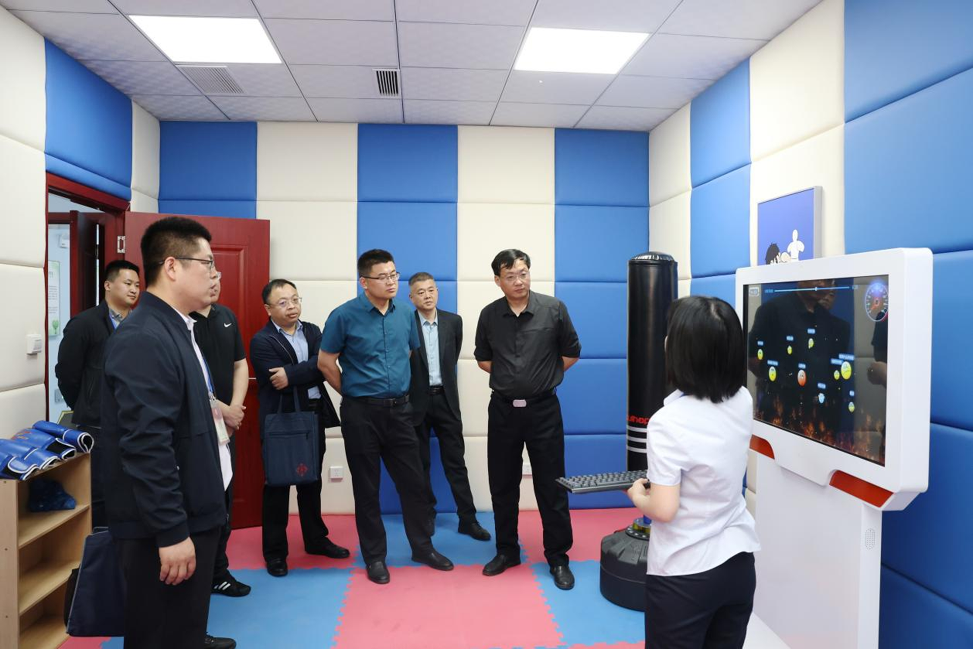 调研组一行先后来到学校心理健康教育中心、健身中心等地进行实地考察,详细了解了心理健康教育中心的工作流程和机制,亲身体验了心理健康教育中心的沉浸式VR虚拟训练平台、智能击打呐喊综合宣泄仪、身心减压放松调养舱等训练系统。