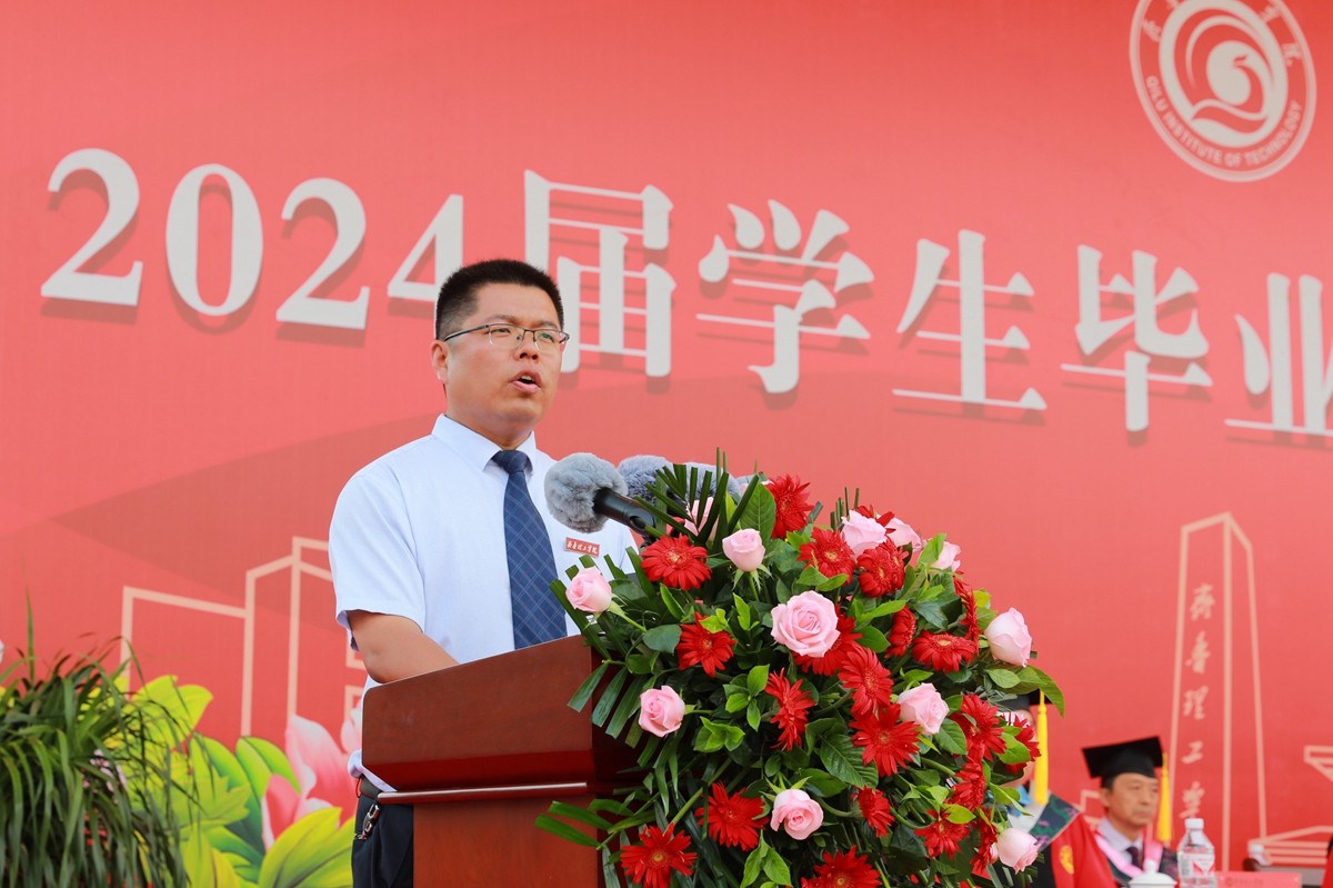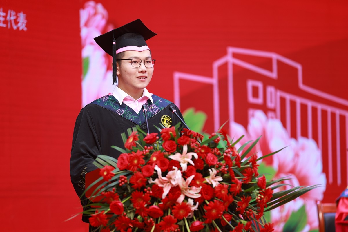 新闻与传播学院马绪威、文学院蔡智远代表全体毕业生发言,计算机与信息工程学院执行院长付海燕、艺术学院执行院长高良博分别代表教师发言。