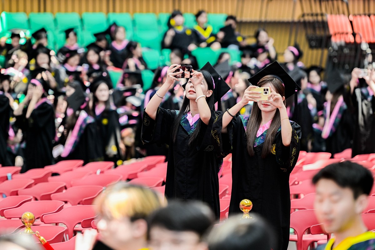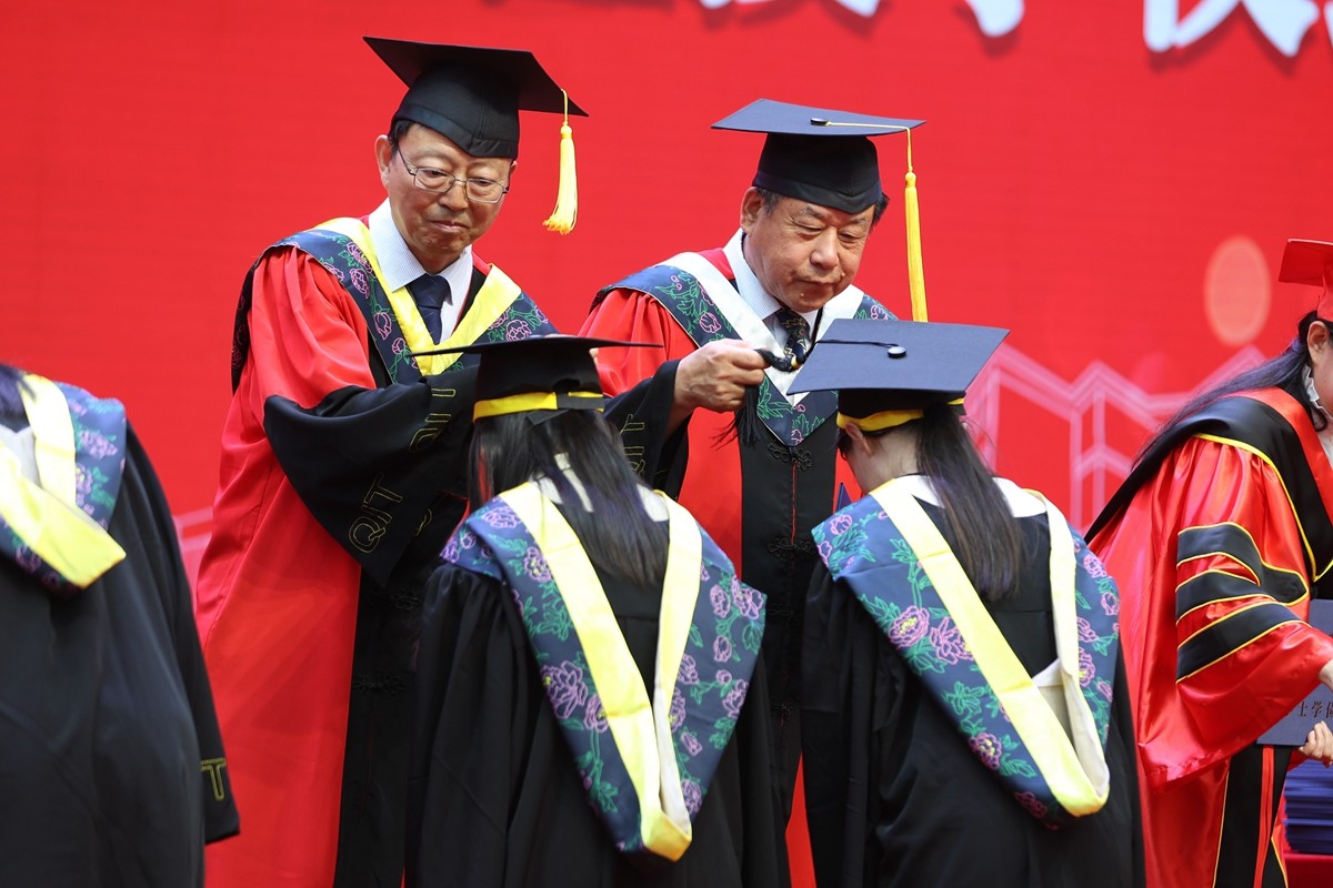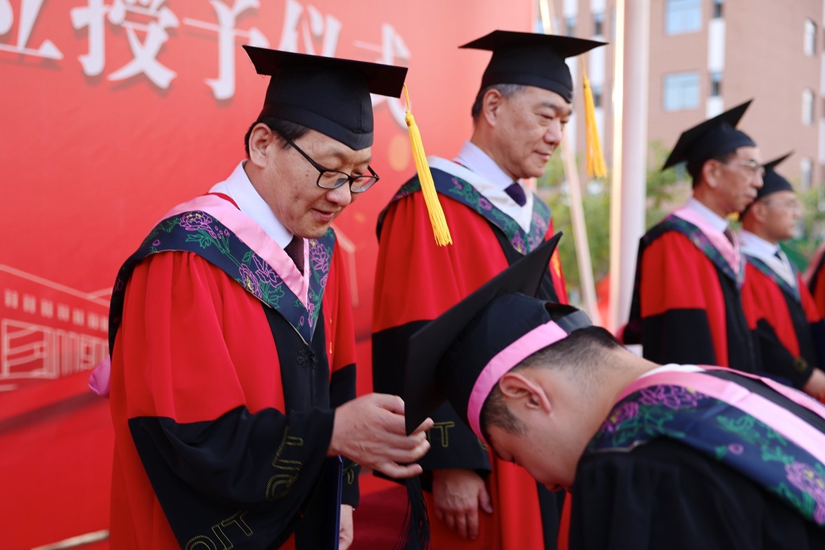 学位授予仪式上,毕业生们满怀喜悦和激动的心情,依次走上主席台,由学校学位委员会委员拨穗正冠、授予学位证书,并合影留念。